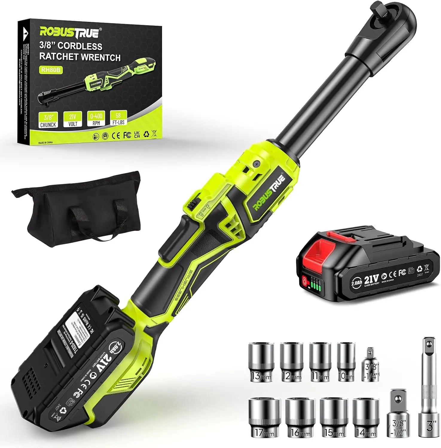 Meet the Robustrue Cordless Ratchet Wrench, a 3/8" drive powerhouse designed to deliver high torque, steady speed, and exceptional reach in a compact, lightweight package. With a maximum of 58 ft-lbs (80 N.m) of torque and 400 RPM, this tool makes quick work of stubborn fasteners, from automotive jobs to furniture assembly. Its 6" extended neck opens up tight spaces that other wrenches can’t reach, while the built-in LED light ensures visibility in dim or shadowed areas. The kit includes a 2000mAh battery, a charger, a 3" extension bar, 8 sockets (10–17 mm), and a convenient carrying bag for on-the-go projects.